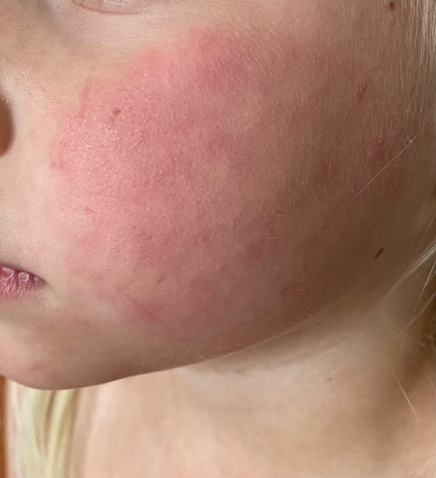 It always seems to happen that way! To cancel or not to cancel? I had mere hours to make the decision. Her face was flushed, but not in a “I just ran around the block way.” It was a very definitive, large red blotch on her face with bumps that looked like a rash. It came out of the blue, it was hot to the touch and her demeanor had shifted from bubbly to quiet and sad.